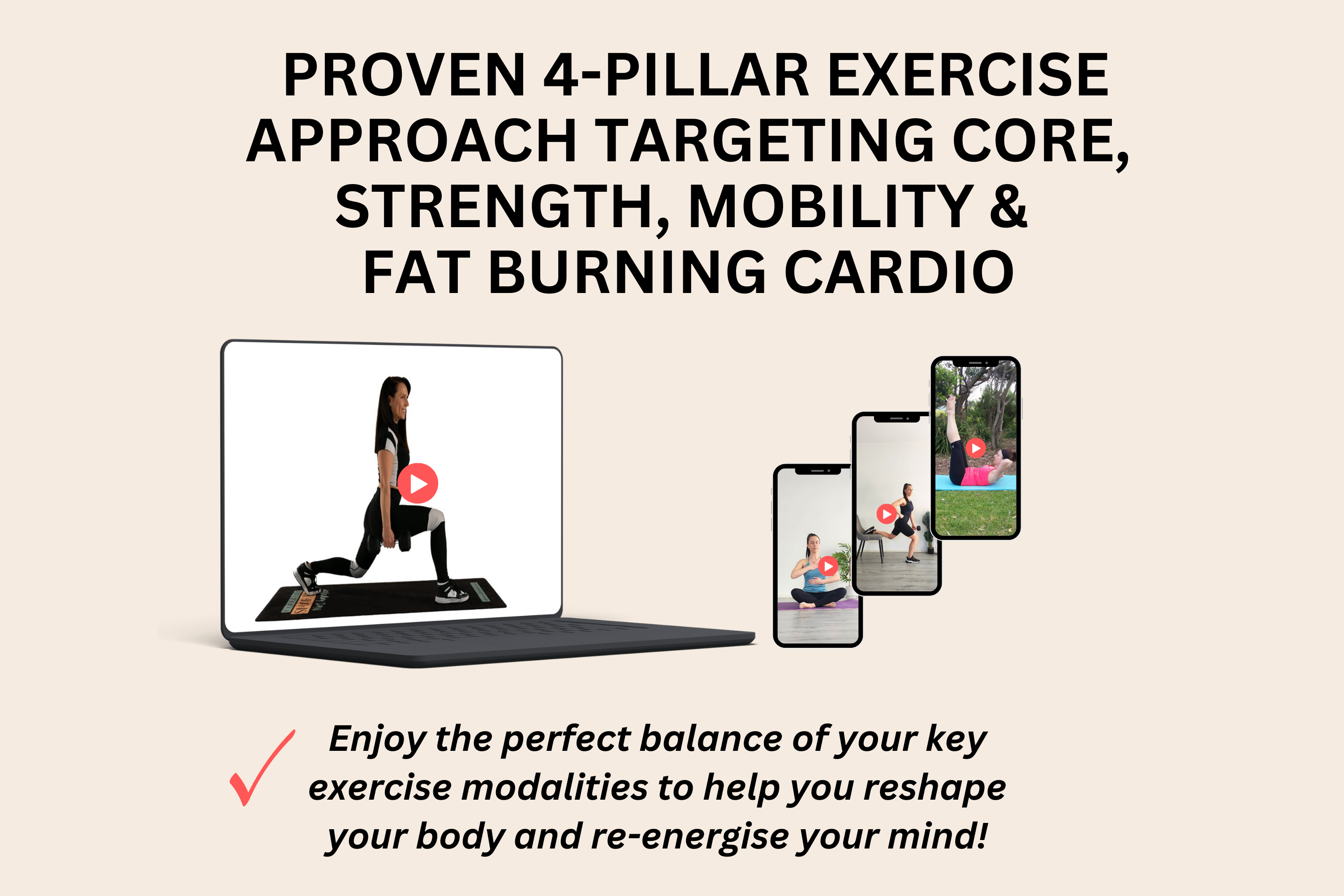 Your program follows Vanessa’s proven 4-Pillar Approach—targeting core stability, full-body strength, fat-burning cardio, and mobility. This balanced formula ensures you reshape your body safely and effectively while improving the way you move every day.