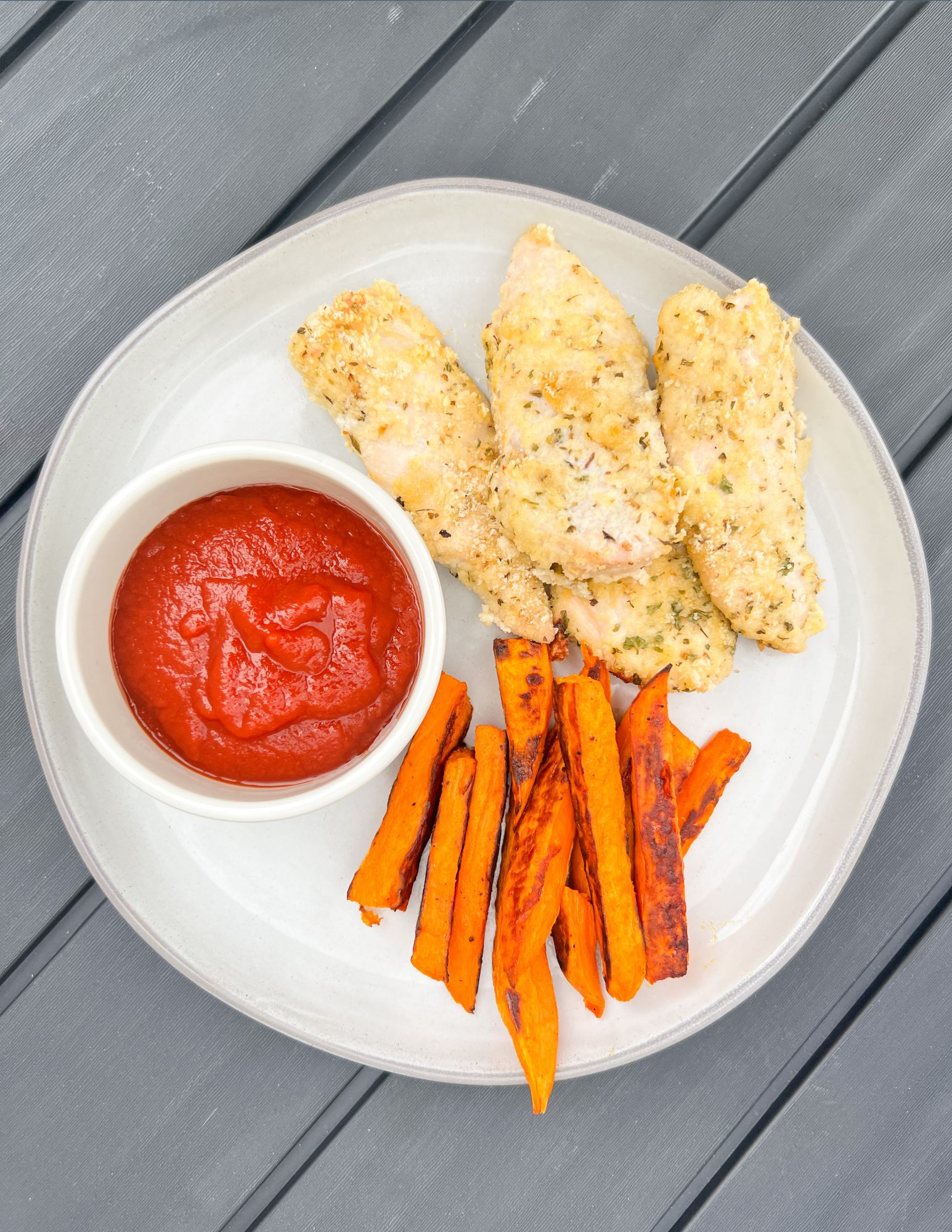 HOME MADE CHICKEN STRIPS + SWEET POTATO FRIES